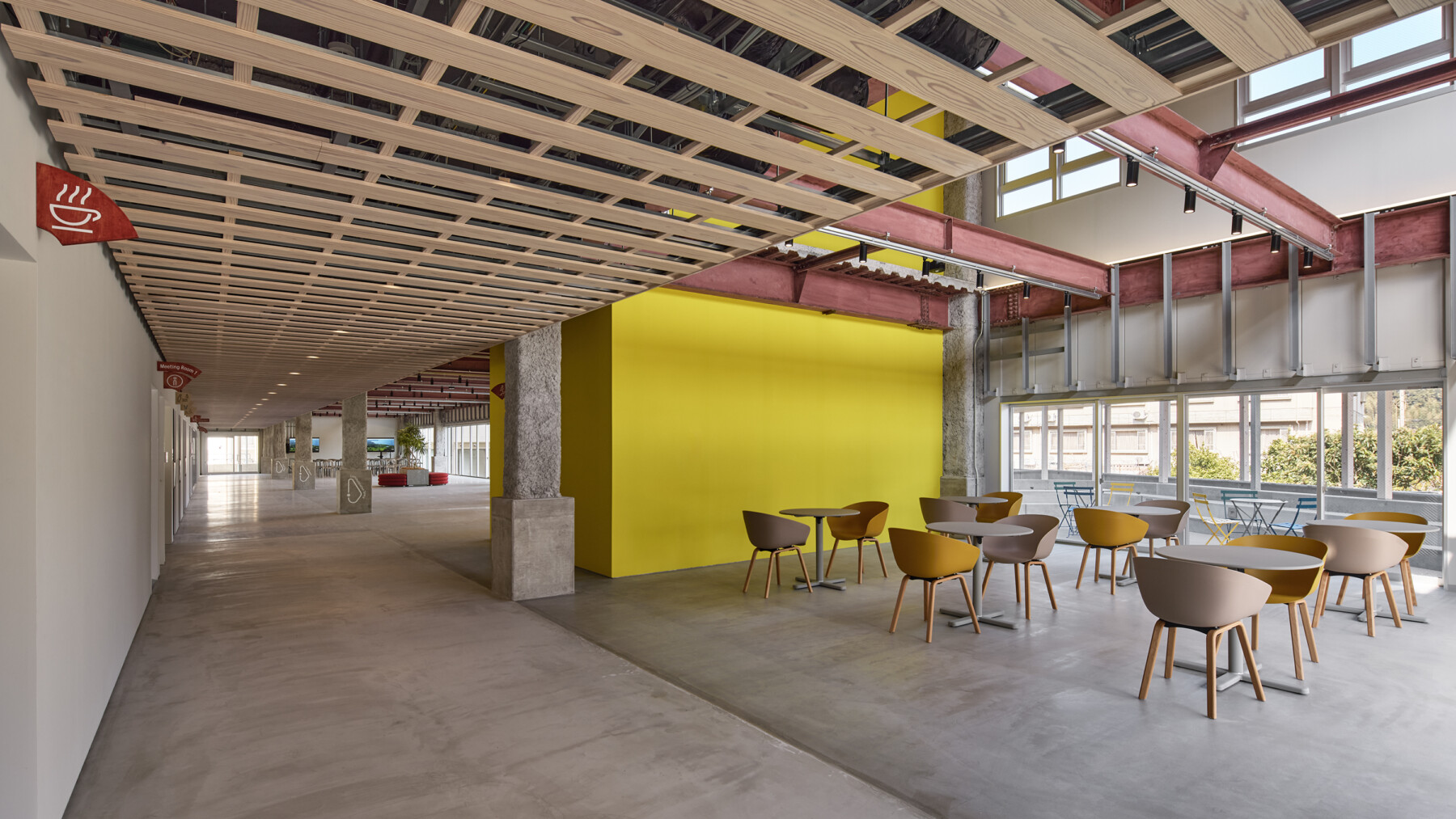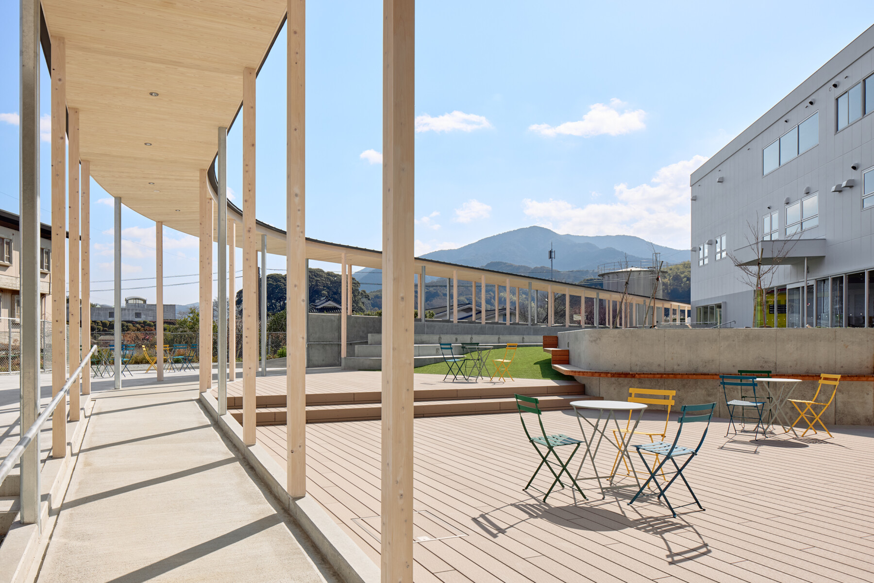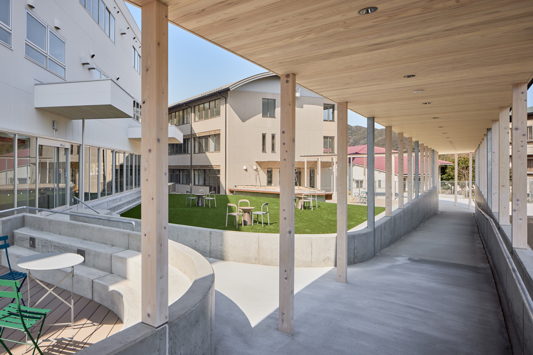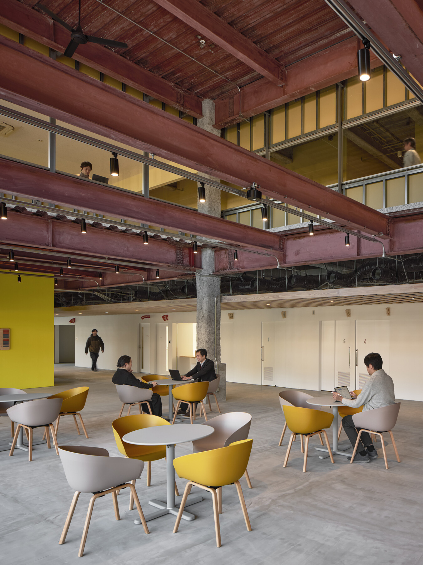 整備方針として建築の余白だけでなく、まちの余白もこの施設の一部と捉えることでまちを巻き込み、施設内で完結しがちなコミュニティやアクティビティがまちへと拡張することで、既存棟の改修に加えて、ひと・モノ・コトをつなぐ「リング状の回遊歩廊」(リング)を新たに提案した。このリングは棟間を機能的にスムーズにつなぐだけでなく、既存建物の閉鎖的な構えを地域に開き、施設利用者だけでなく地元の人たちも気軽に立ち寄れるような構えをつくる。また、リングで囲まれた中庭は快適な屋外空間となり、テラスではお茶をしながら快適に仕事ができたり、芝生広場ではヨガレッスンなどのイベントも開催することが可能である。