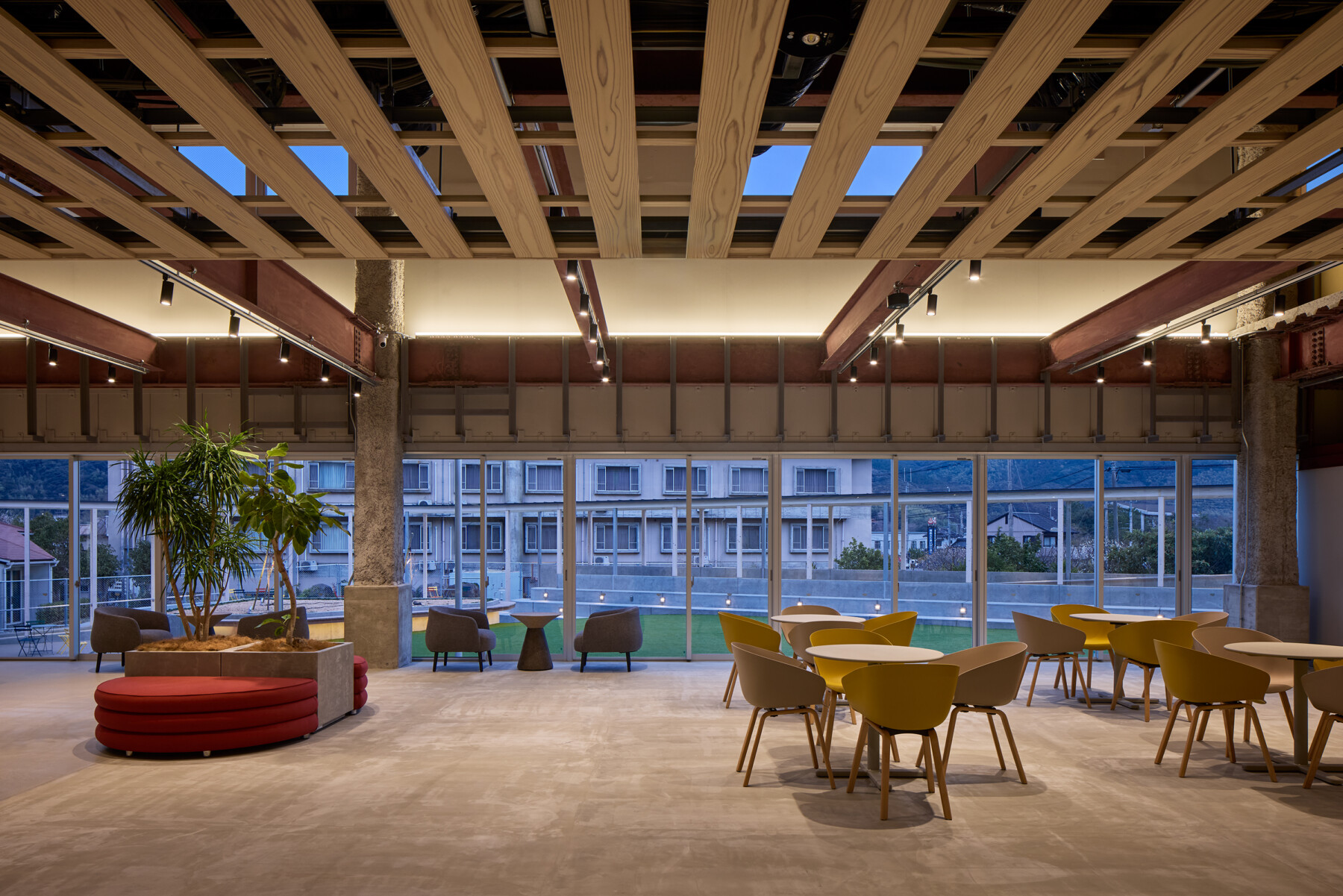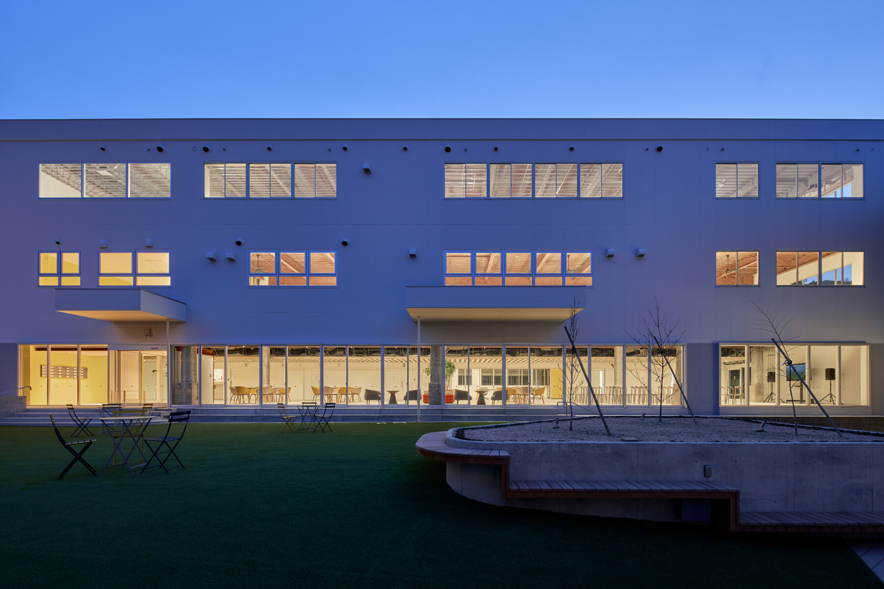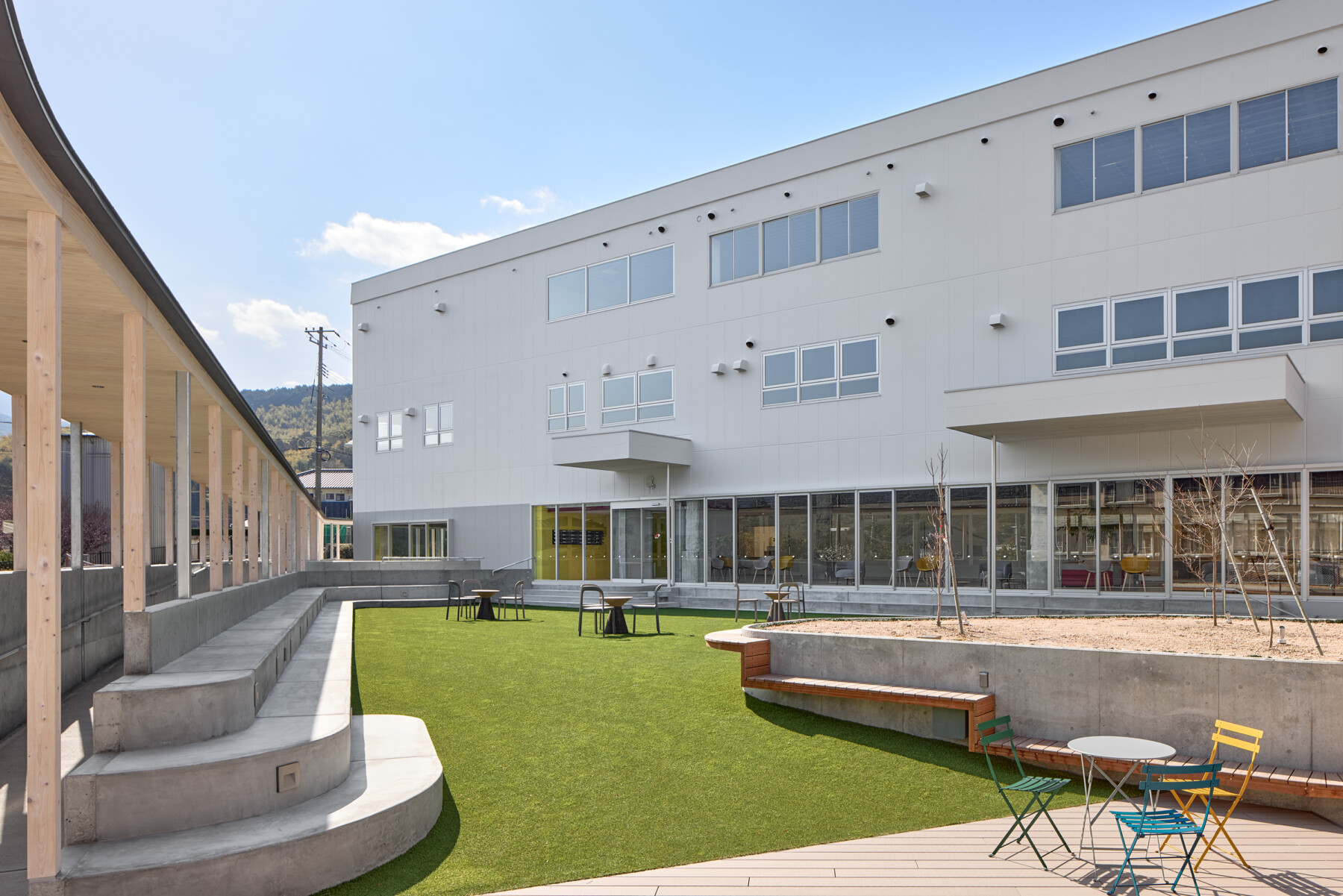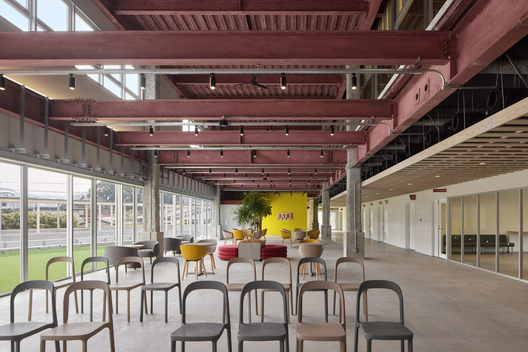 Furthermore, the courtyard enclosed by the ring becomes a comfortable outdoor space, where people can work comfortably while enjoying tea on the terrace, and events such as yoga lessons can be held on the lawn. Rather than just creating a lively atmosphere within the facility, the hope is that by inserting the ring, people will spill out into the town, creating a venture village that spreads outwards.