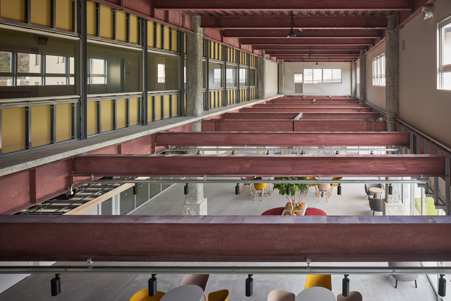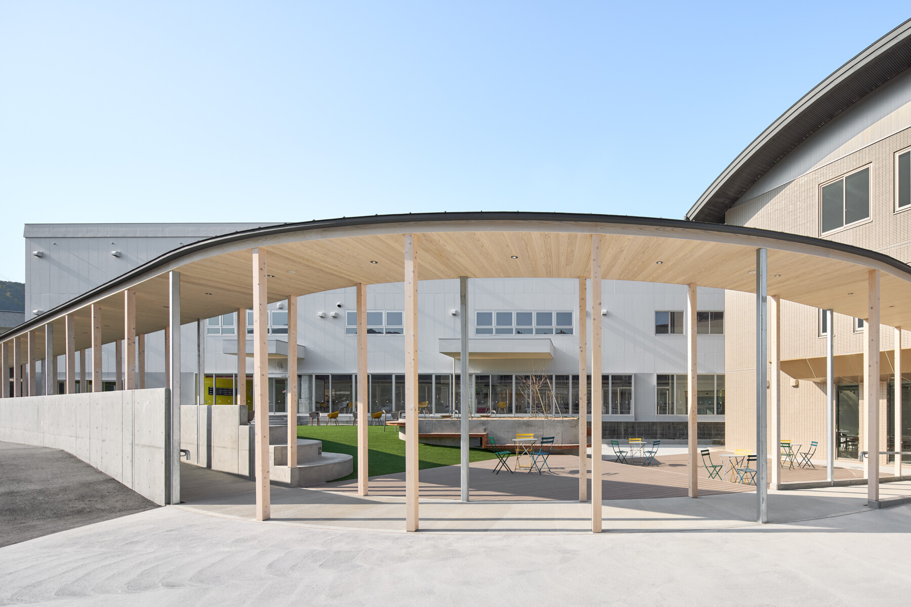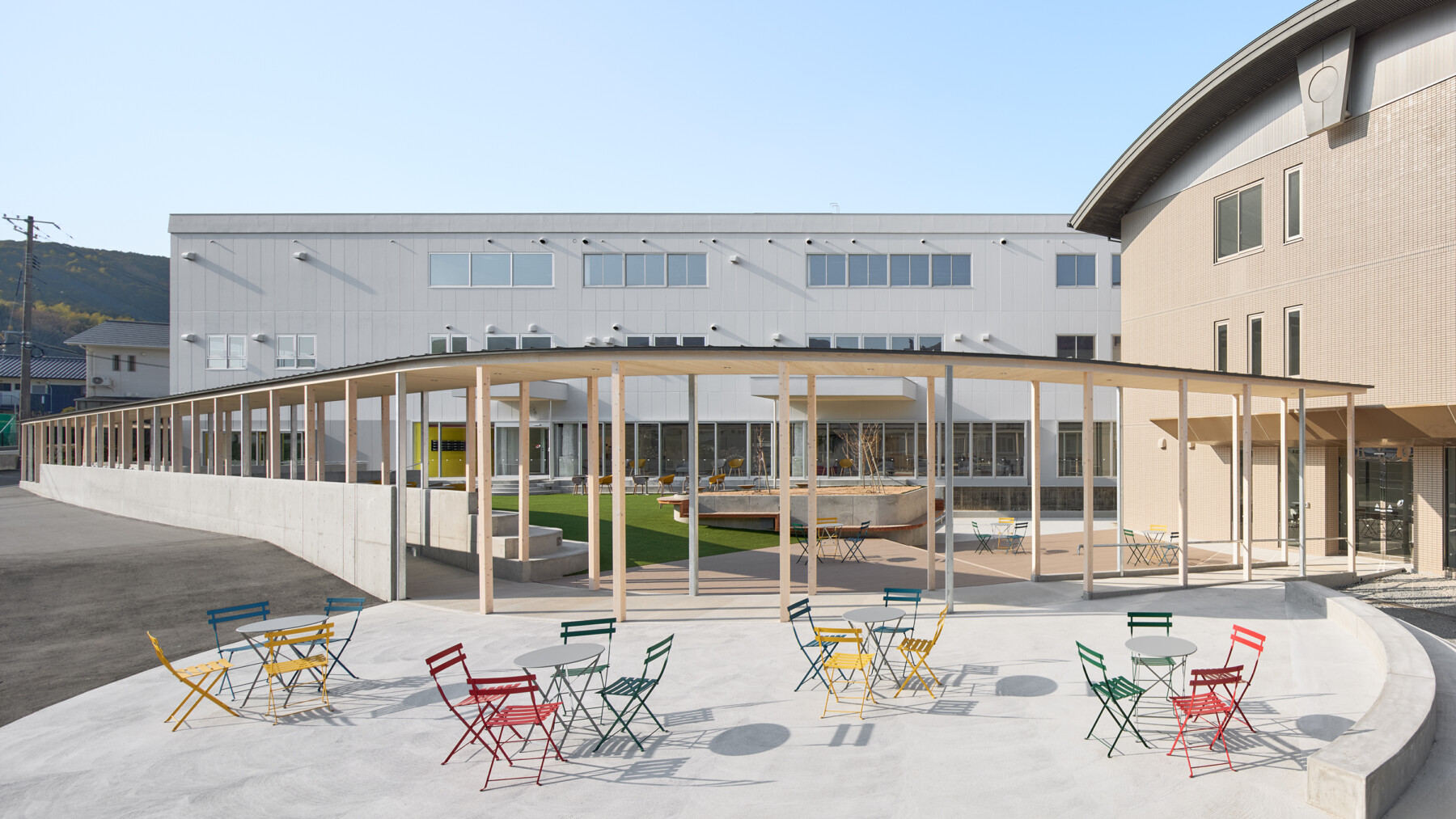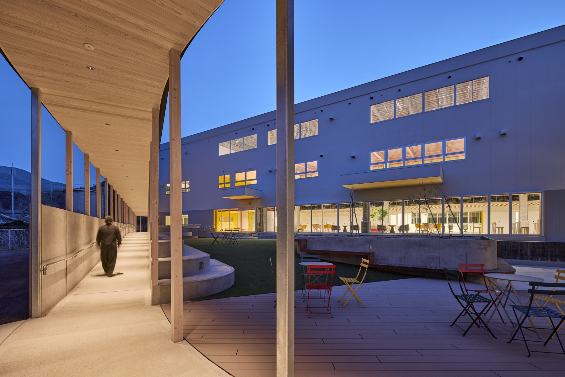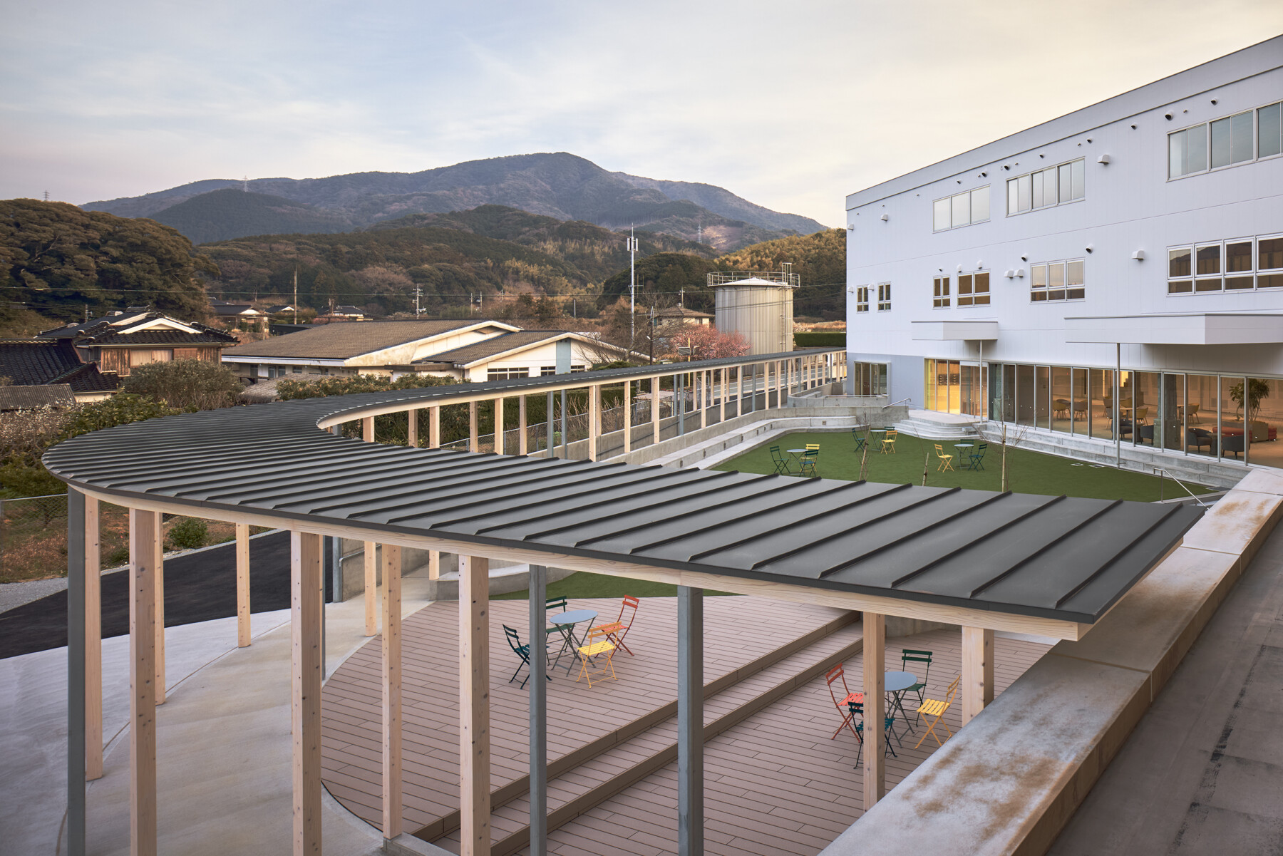 Furthermore, the courtyard enclosed by the ring becomes a comfortable outdoor space, where people can work comfortably while enjoying tea on the terrace, and events such as yoga lessons can be held on the lawn. Rather than just creating a lively atmosphere within the facility, the hope is that by inserting the ring, people will spill out into the town, creating a venture village that spreads outwards.