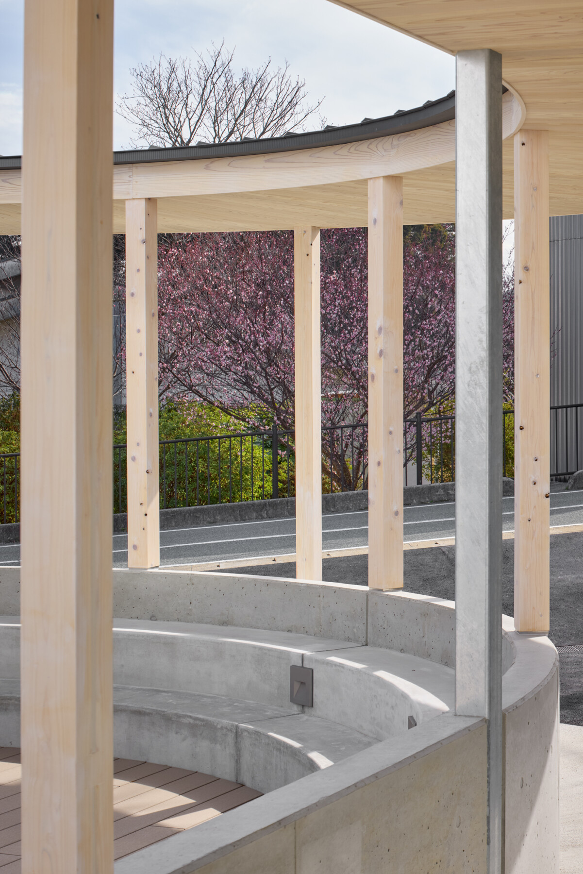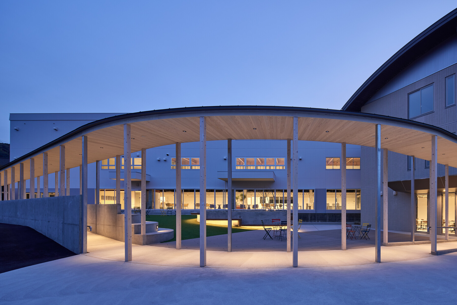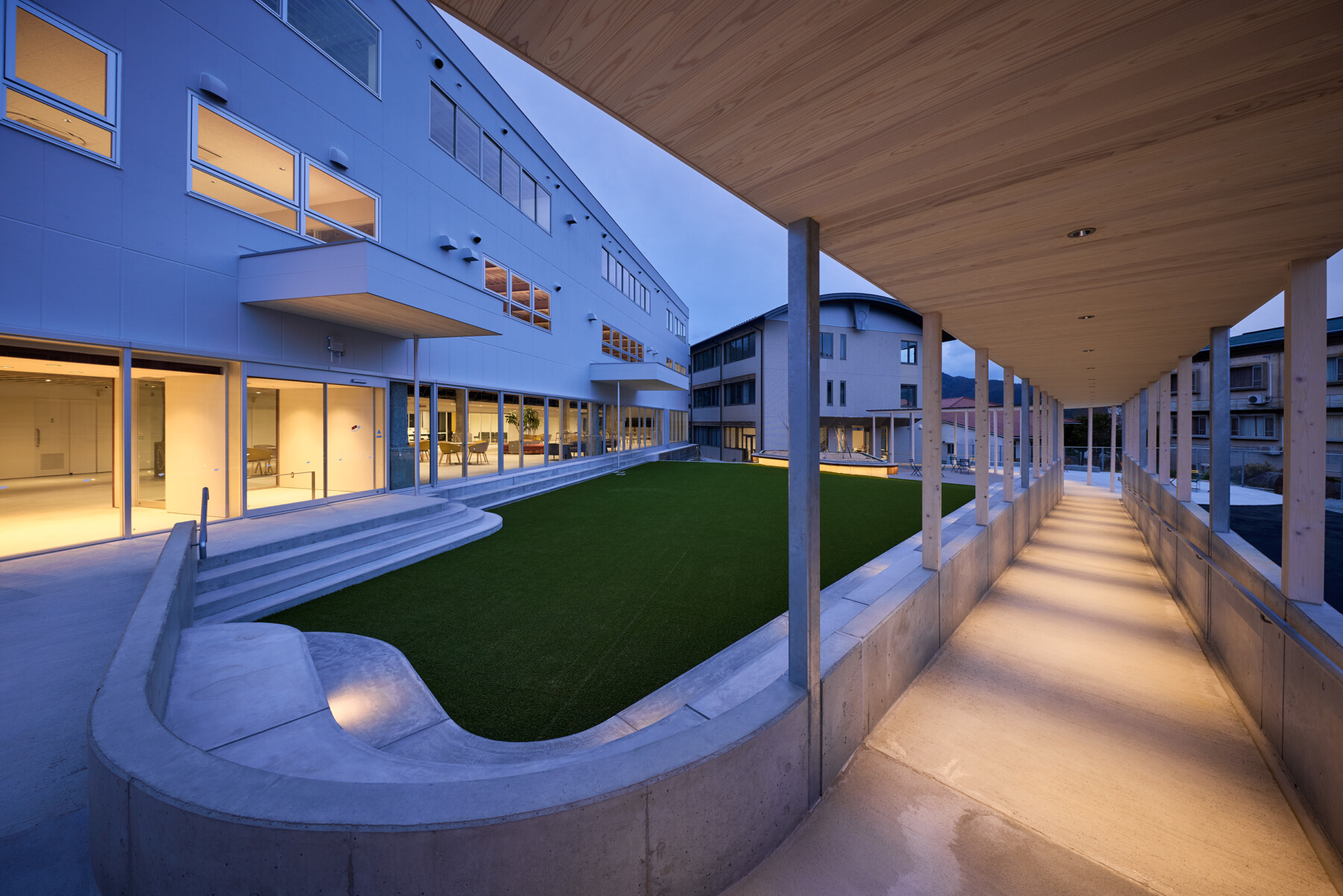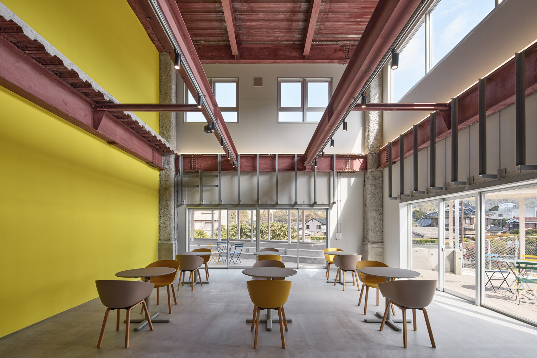 Furthermore, the courtyard enclosed by the ring becomes a comfortable outdoor space, where people can work comfortably while enjoying tea on the terrace, and events such as yoga lessons can be held on the lawn. Rather than just creating a lively atmosphere within the facility, the hope is that by inserting the ring, people will spill out into the town, creating a venture village that spreads outwards.