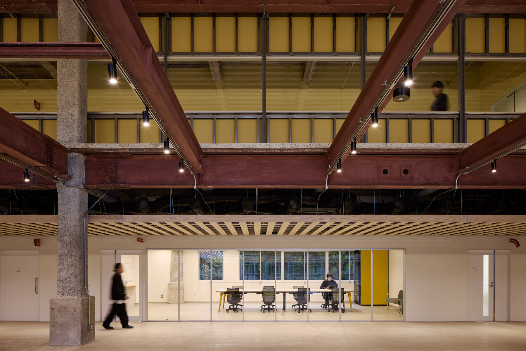 改修計画としては、敷地内の既存2棟について、大きな吹き抜けをつくり、庭へとつながる建具で多様な交流を促すA棟と、なるべく既存の状態を活かしてオフィスを集中的に配するB棟として新たに整理し、あえて仕上げや空間には余白を残すことで、将来的な拡張性を備えることとした。